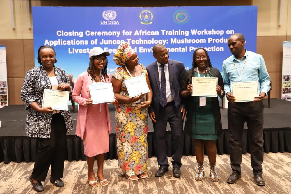 8月初,在非洲地區菌草技術培訓班舉(ju) 辦期間,聯合國官員和使團代表團專(zhuan) 程赴盧旺達考察菌草技術和產(chan) 業(ye) 在非洲地區的發展。“我很高興(xing) 同其他聯合國官員一起,親(qin) 眼見證菌草技術以實際行動造福民眾(zhong) 。”聯合國秘書(shu) 長辦公室主任考特尼·拉特雷說,菌草技術具有“可負擔”的突出優(you) 勢,“對非洲大陸所有發展中國家很有價(jia) 值、非常適用”。
