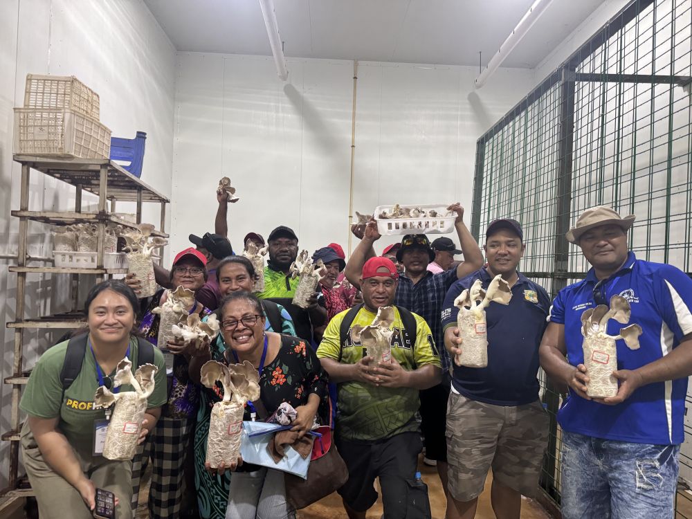 2月28日,在斐濟楠迪,培訓班學員手捧菌草菇合影。新華社發(中國援斐濟菌草技術示範中心供圖)