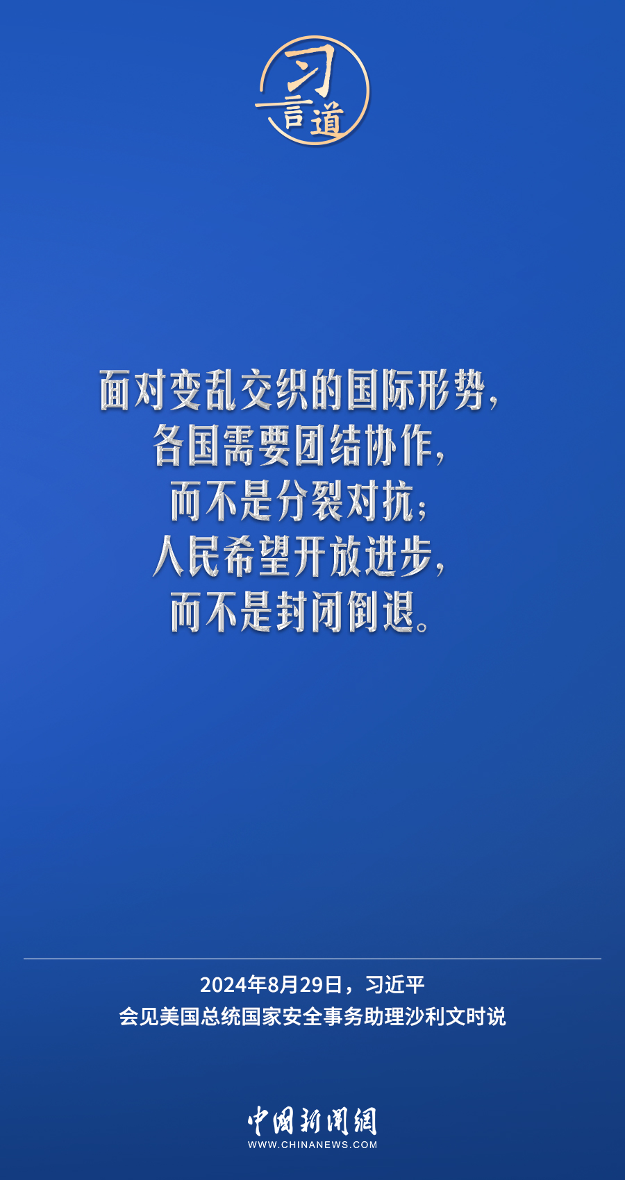 8月29日,國家主席習(xi) 近平在北京人民大會(hui) 堂會(hui) 見美國總統國家安全事務助理沙利文。習(xi) 近平指出——