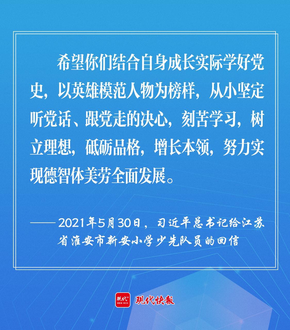 2021年5月30日,習(xi) 近平總書(shu) 記給江蘇省淮安市新安小學少先隊員回信時強調,“希望你們(men) 結合自身成長實際學好黨(dang) 史,以英雄模範人物為(wei) 榜樣,從(cong) 小堅定聽黨(dang) 話、跟黨(dang) 走的決(jue) 心,刻苦學習(xi) ,樹立理想,砥礪品格,增長本領,努力實現德智體(ti) 美勞全麵發展。”