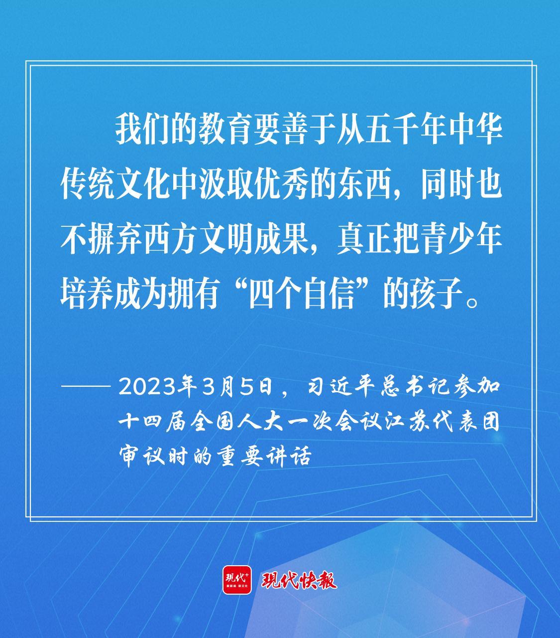 2023年3月5日,習(xi) 近平總書(shu) 記參加十四屆全國人大一次會(hui) 議江蘇代表團審議時,勉勵教育工作者“要善於(yu) 從(cong) 五千年中華傳(chuan) 統文化中汲取優(you) 秀的東(dong) 西,同時也不摒棄西方文明成果,真正把青少年培養(yang) 成為(wei) 擁有‘四個(ge) 自信’的孩子。”