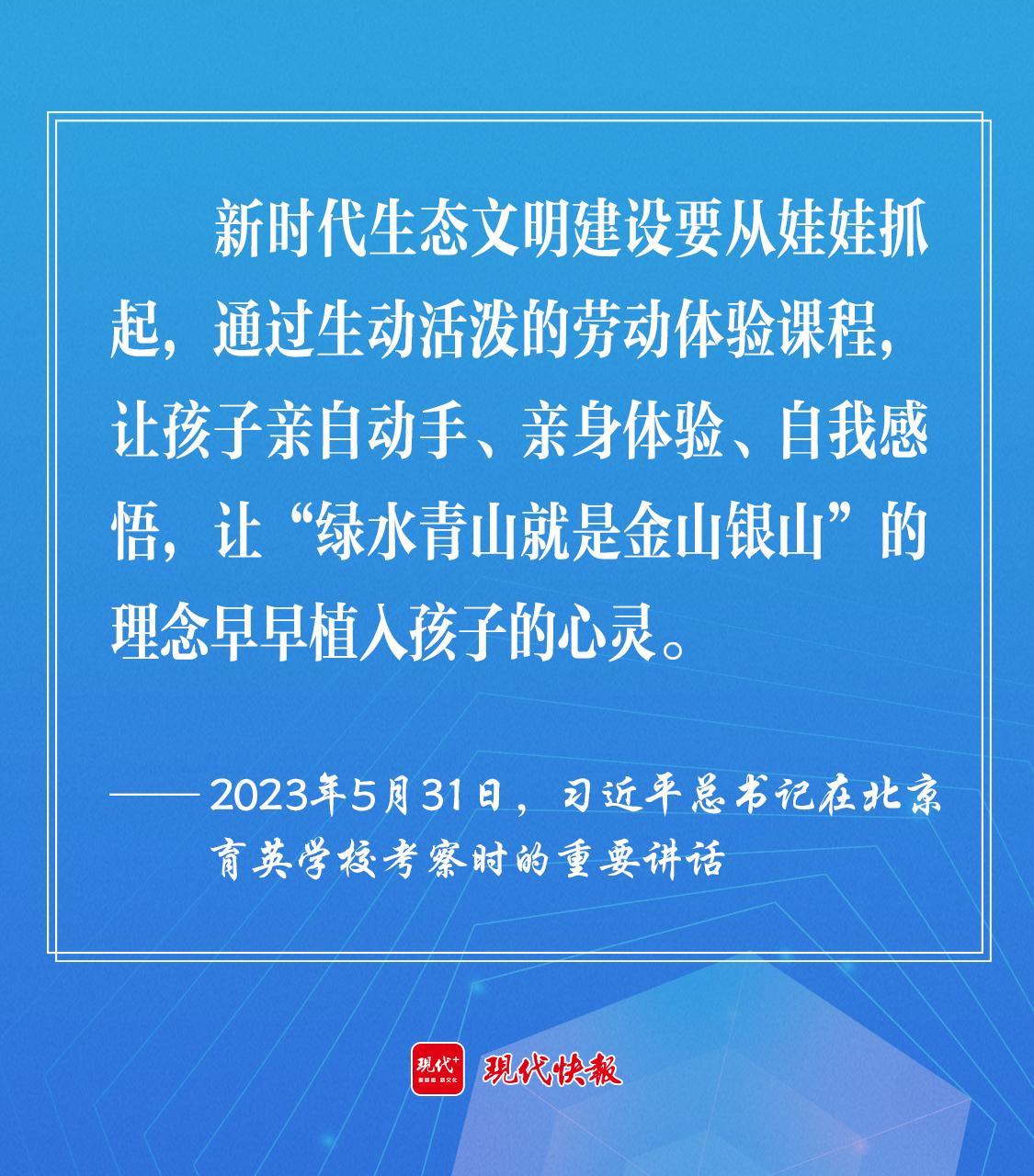 2023年5月,習(xi) 近平總書(shu) 記在北京育英學校考察時強調,新時代生態文明建設要從(cong) 娃娃抓起,通過生動活潑的勞動體(ti) 驗課程,讓孩子親(qin) 自動手、親(qin) 身體(ti) 驗、自我感悟,讓“綠水青山就是金山銀山”的理念早早植入孩子的心靈。