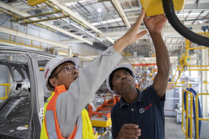 2023年5月9日,在南非東(dong) 開普省北汽南非工廠,電工邦加尼(右)與(yu) 中國同事方龍在焊裝車間內(nei) 工作。新華社記者 張譽東(dong) 攝