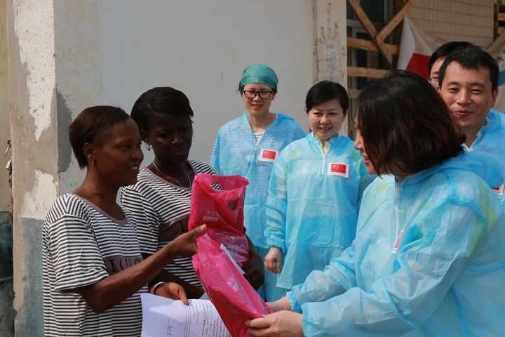 2015年4月4日,在位於(yu) 塞拉利昂首都弗裏敦市郊的中塞友好醫院埃博拉診療中心,中國第四批援塞醫療隊副隊長邵蔚(右前)向被治愈的埃博拉出血熱患者贈送禮物。新華社發(祖榮強 攝)