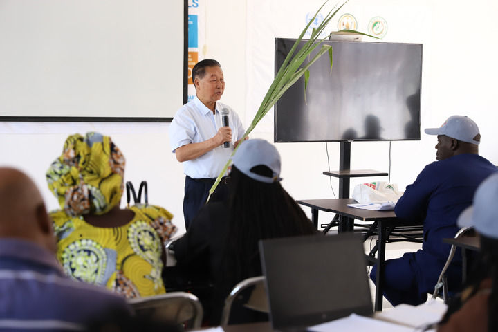 2024年8月4日,在位於(yu) 盧旺達南方省胡耶區的中國援盧農(nong) 業(ye) 技術示範中心,菌草發明人林占熺為(wei) 培訓班學員講解菌草技術。新華社發(黃萬(wan) 晴攝)