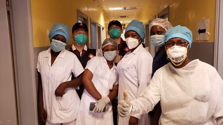2020年5月26日,中國抗疫醫療專(zhuan) 家組在剛果(布)首都布拉柴維爾指導新冠肺炎病房建設時,與(yu) 當地一線醫務人員合影。新華社發