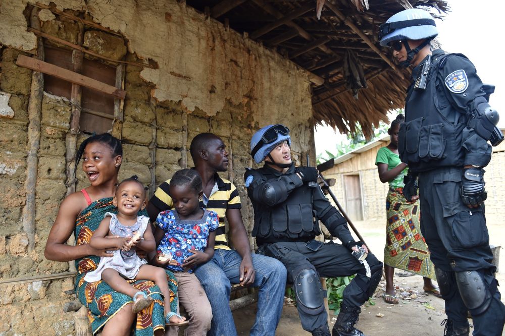 2015年11月3日,在利比裏亞(ya) 格林維爾一座村莊,中國維和警察防暴隊隊員詢問近期治安等情況。