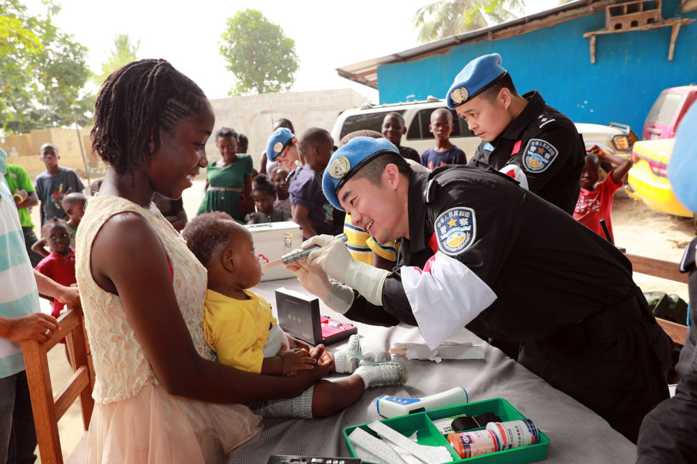 2017年12月28日,在利比裏亞(ya) 蒙羅維亞(ya) ,中國維和警察防暴隊醫療人員為(wei) 兒(er) 童做口腔檢查。