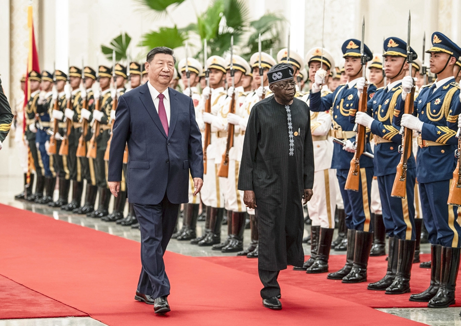 9月3日下午,國家主席習(xi) 近平在北京人民大會(hui) 堂同來華出席中非合作論壇北京峰會(hui) 並進行國事訪問的尼日利亞(ya) 總統提努布舉(ju) 行會(hui) 談。這是會(hui) 談前,習(xi) 近平在人民大會(hui) 堂北大廳為(wei) 提努布舉(ju) 行歡迎儀(yi) 式。新華社記者 李濤 攝