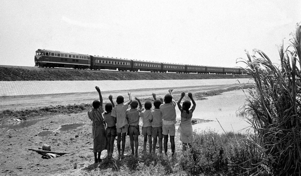 讚比亞(ya) 魯西瓦西湖畔的少年兒(er) 童歡迎坦讚鐵路的列車通到他們(men) 的家鄉(xiang) (1976年攝)。新華社發