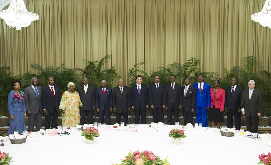 圖為(wei) 2013年3月28日,國家主席習(xi) 近平在南非德班同非洲國家領導人早餐會(hui) 合影。新華社發