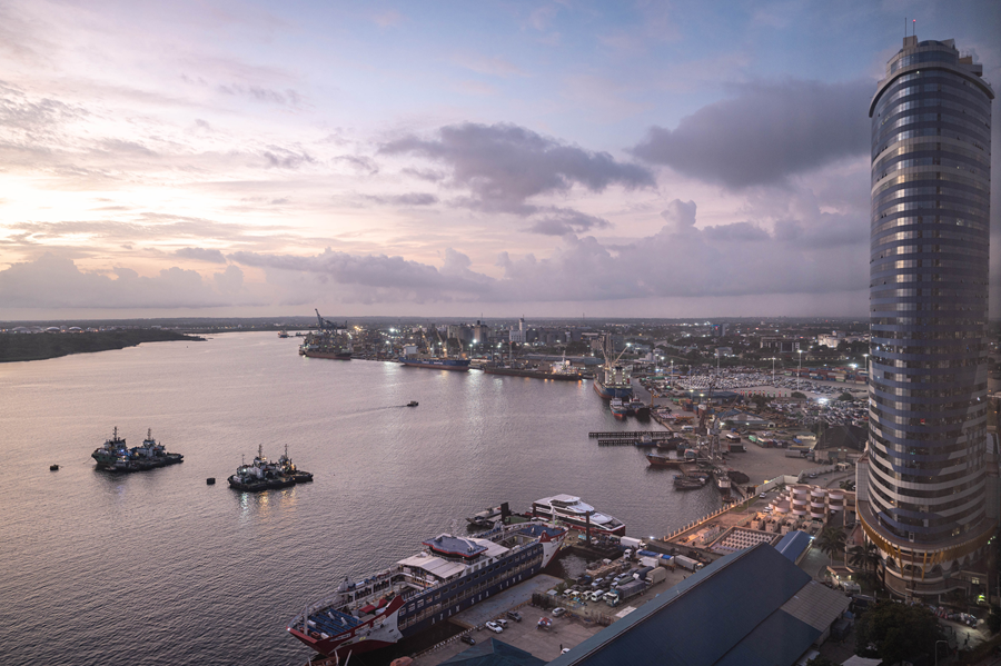 這是2023年12月29日拍攝的日出時分的坦桑尼亞(ya) 達累斯薩拉姆港。新華社記者 王冠森 攝