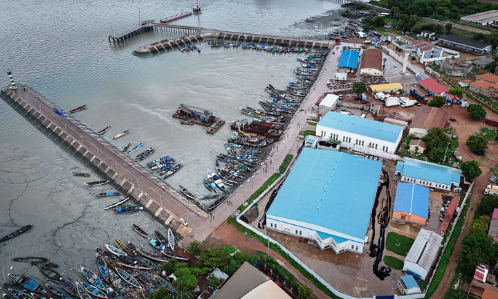 這是2024年7月8日在幾內(nei) 亞(ya) 比紹首都比紹拍攝的板丁漁業(ye) 碼頭和中企投建的水產(chan) 品加工存儲(chu) 綜合設施(右側(ce) 藍頂建築區域)(無人機照片)。新華社記者 韓旭 攝