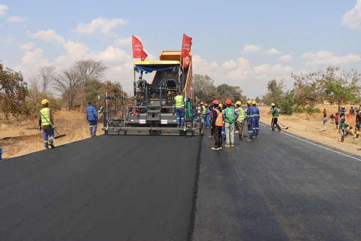 2024年8月27日,在馬拉維恩科塔科塔,施工人員在卡帕滕加至本加公路升級改造項目路段鋪築瀝青路麵。新華社發