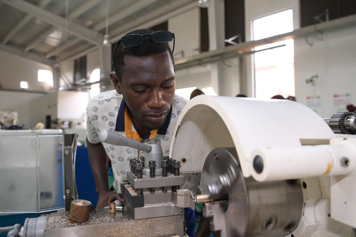 2023年1月10日,在加蓬首都利伯維爾的恩考克經濟特區,恩考克國際職業(ye) 教育和培訓中心(由中國航空技術國際控股有限公司聯合成都航空職業(ye) 技術學院等院校共建)的學生進行車削加工操作訓練。新華社記者 韓旭 攝