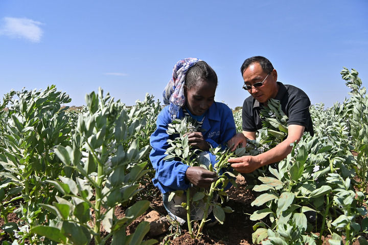 2023年9月27日,在位於(yu) 厄立特裏亞(ya) 阿斯馬拉的農(nong) 業(ye) 技術援助項目示範地,中國援厄第三期高級農(nong) 業(ye) 專(zhuan) 家組豆類作物專(zhuan) 家劉運民(右)指導當地農(nong) 戶進行蠶豆作物的田間管理。新華社記者 韓旭 攝