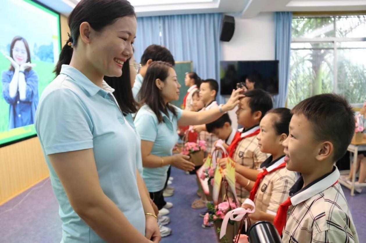 2023年教師節前,廣西南寧一所學校,學生向老師獻上鮮花、賀卡。