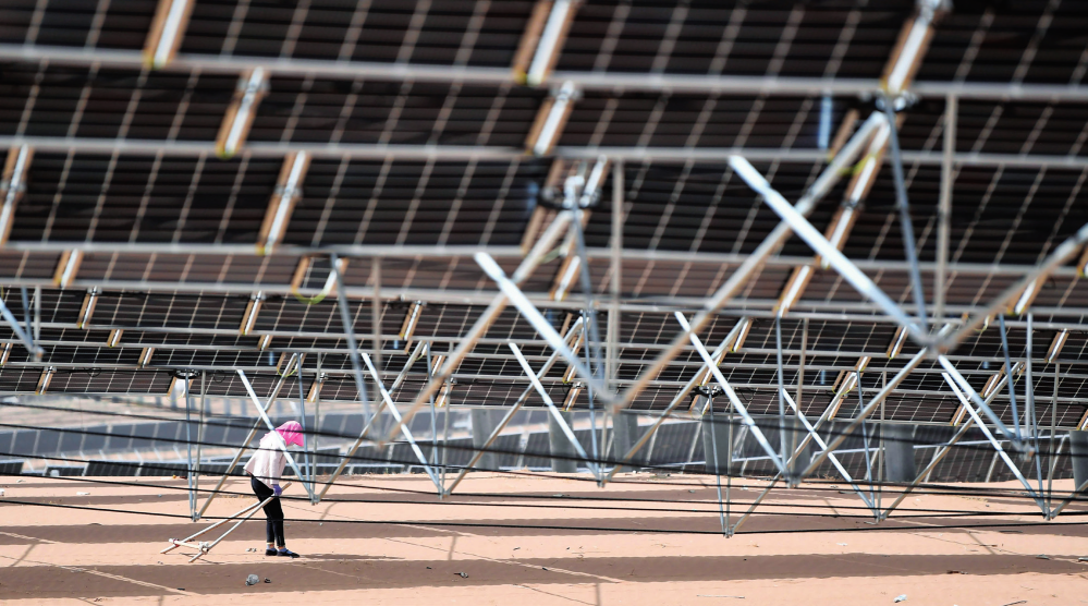 在甘肅省武威市涼州區九墩灘光伏治沙示範園區,工人在光伏板下作業(ye) (2023 年 5 月 19 日攝) 陳斌攝 / 本刊