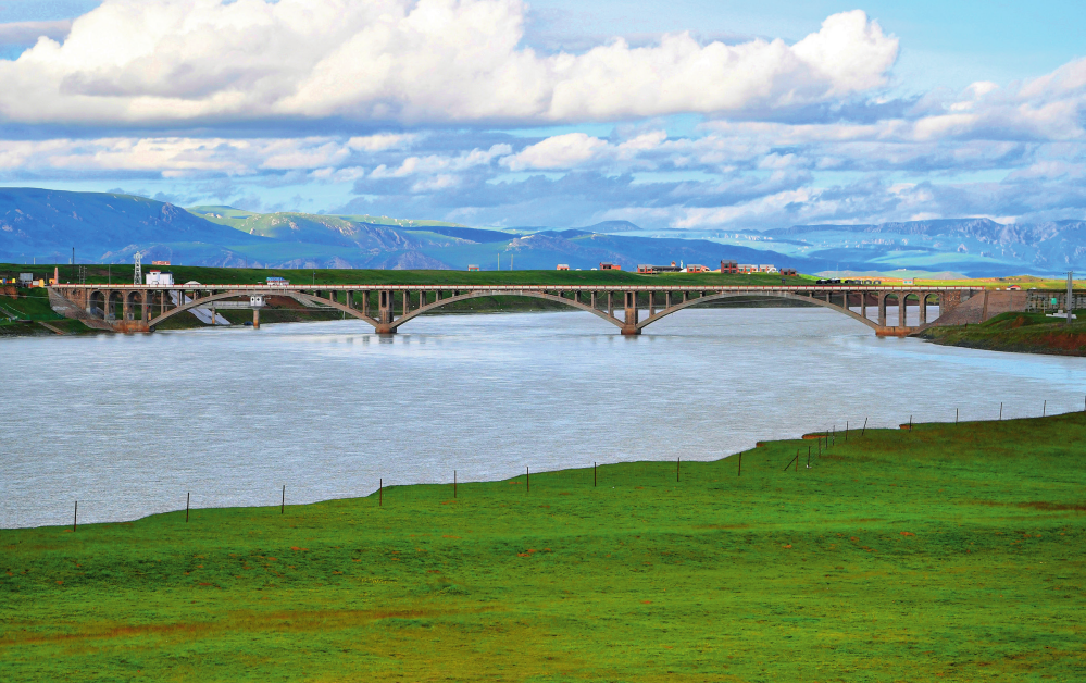 甘肅省甘南藏族自治州瑪曲縣城郊的黃河大橋附近的沙化退化草場已經複綠(2023 年7月6日攝) 陳斌攝 /本刊
