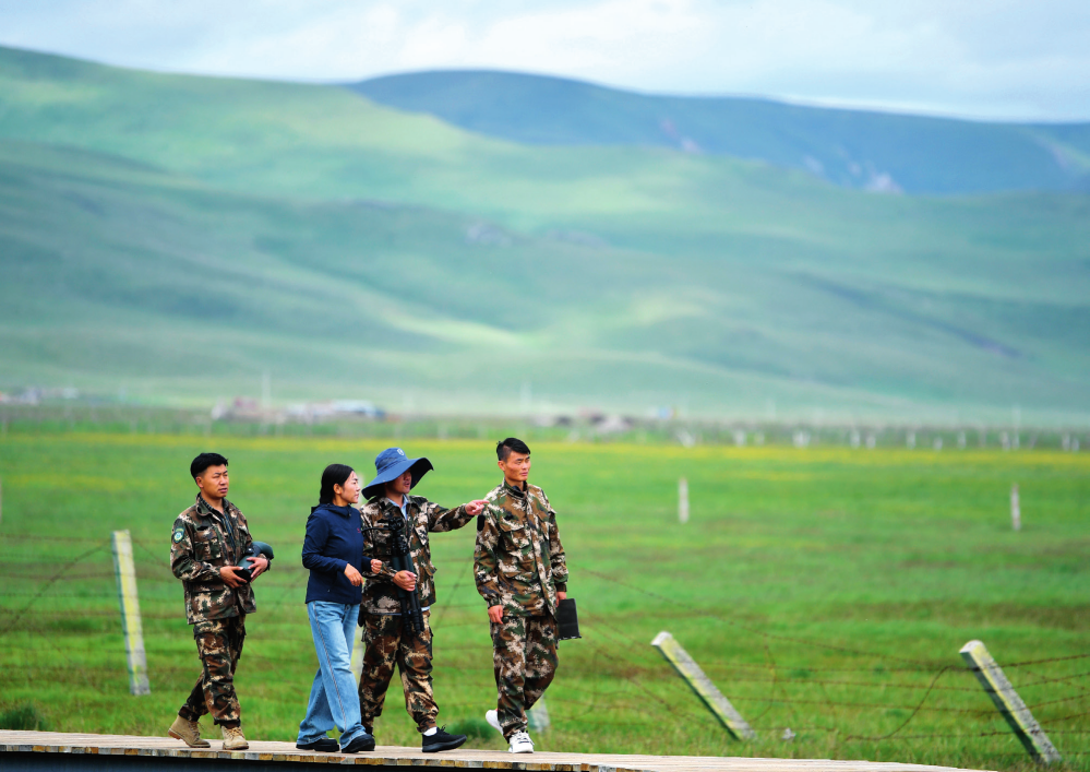 甘肅尕海則岔國家級自然保護區管護中心尕海保護站站長香毛吉 ( 左二)和同事在保護區內(nei) 巡護(2023 年 7 月 7 日攝)陳斌攝 / 本刊