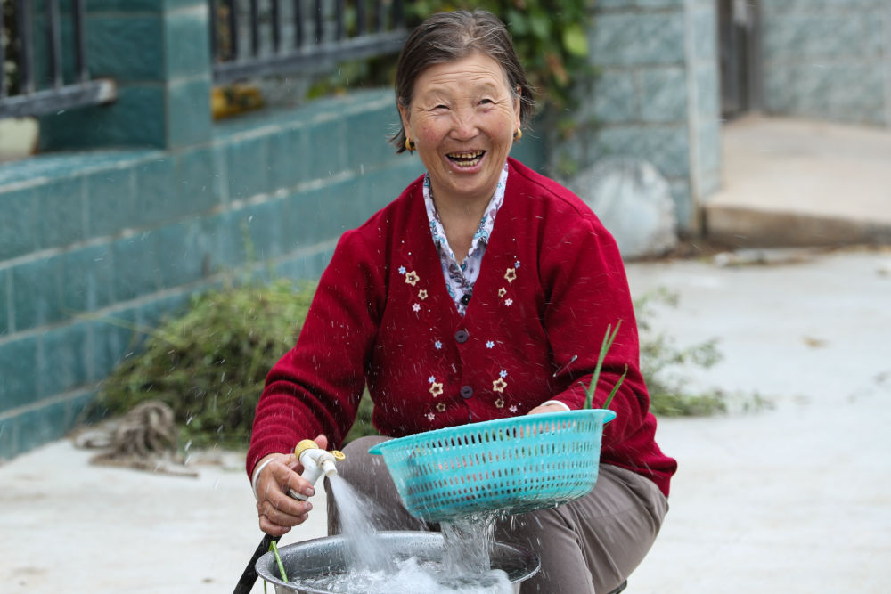 近日,在定西市隴西縣雙泉鎮癿羊口村,68歲的村民何淑蘭(lan) 用引洮工程引來的自來水洗菜。新華社記者 郎兵兵 攝