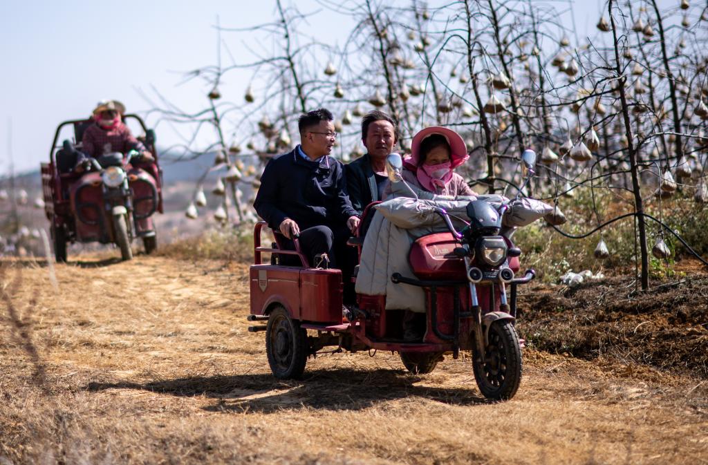 全國人大代表袁海波(右三)在雲(yun) 南省曲靖市馬龍區一種植基地了解務工人員就業(ye) 需求(2023年2月11日攝)。 新華社記者 江文耀 攝