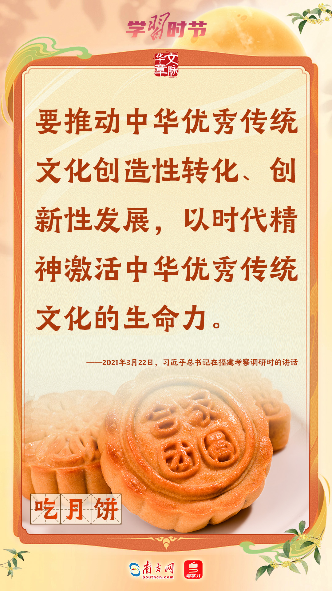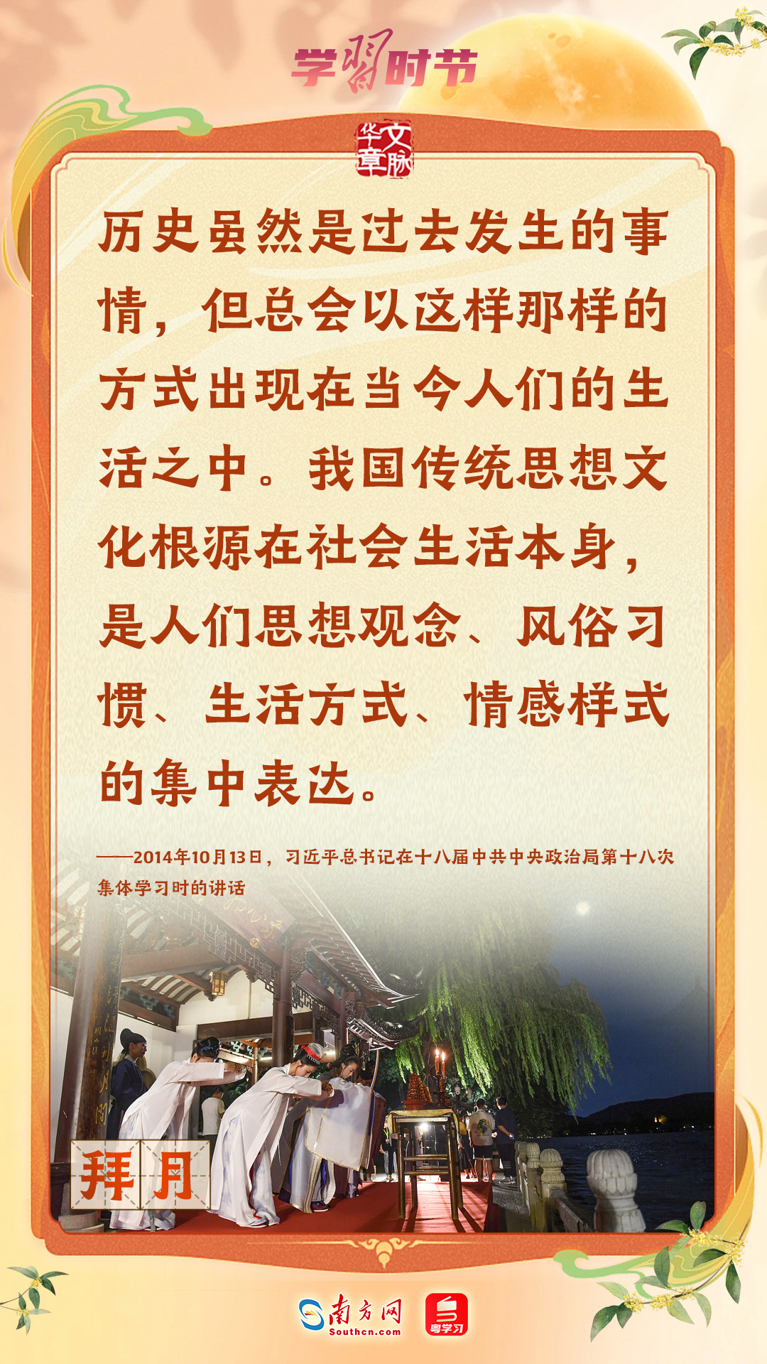 品月餅、賞月拜月、看花燈、飲桂花酒……作為(wei) 我國重要的傳(chuan) 統節日,中秋節蘊含著中華優(you) 秀傳(chuan) 統文化的精髓。習(xi) 近平總書(shu) 記一直以來高度重視傳(chuan) 統節日和傳(chuan) 統文化,曾多次強調要發揮其寶貴價(jia) 值和獨特作用。