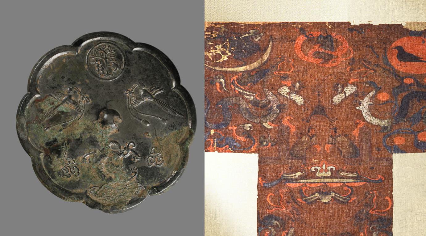 △陝西曆史博物館珍藏的雙鸞月宮紋葵花形鏡(左)和湖南博物院展出的馬王堆漢墓出土的T形帛畫(右)