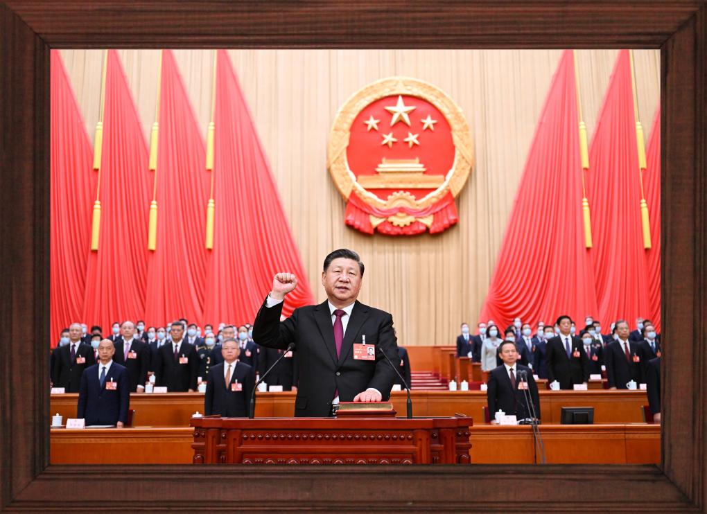 2023年3月10日,北京人民大會(hui) 堂。全票當選國家主席、中央軍(jun) 委主席的習(xi) 近平,左手撫按《中華人民共和國憲法》,右手舉(ju) 拳,麵向近3000名全國人大代表,鄭重宣誓。