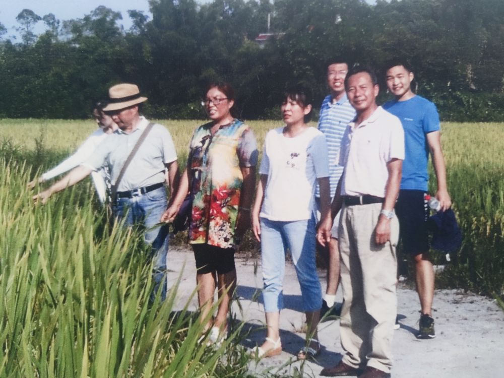 2014年,馬均(右二)帶領學生在永豐(feng) 村與(yu) 當地農(nong) 技人員交流。