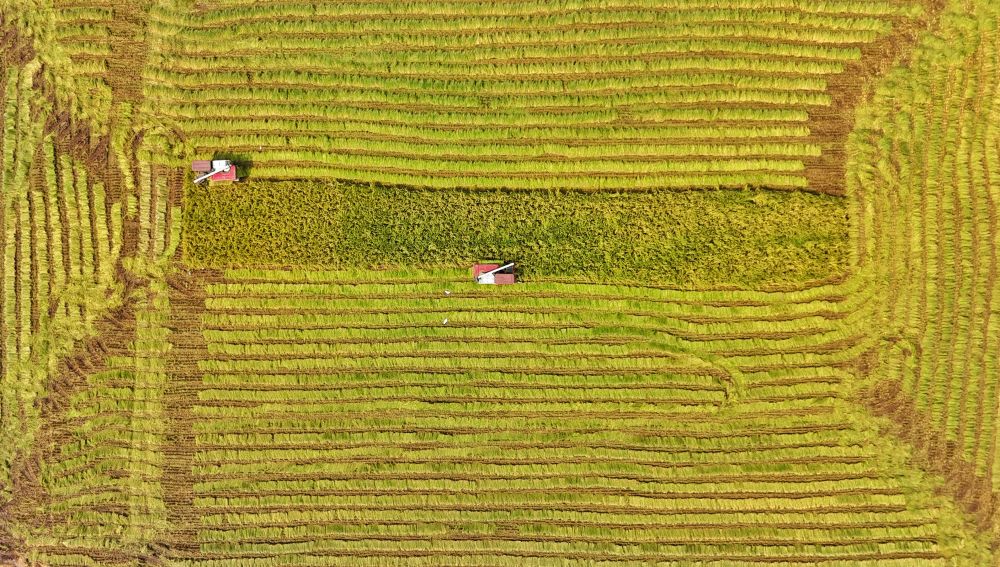 2024年8月22日,收割機在永豐(feng) 村高標準農(nong) 田內(nei) 收割水稻(無人機照片)。團隊預計,2024年永豐(feng) 村高標準農(nong) 田平均畝(mu) 產(chan) 將接近800公斤。