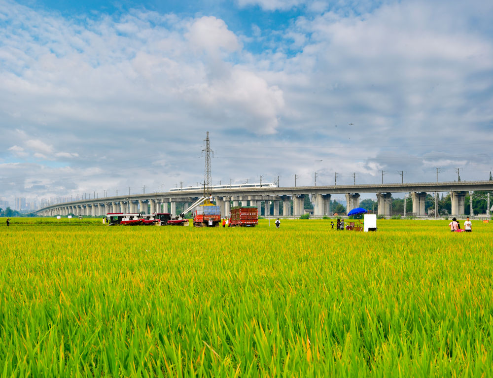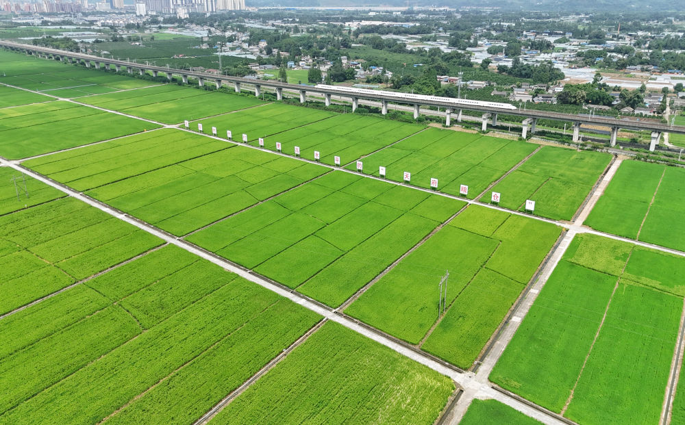 2024年7月26日,一列高鐵列車從(cong) 永豐(feng) 村高標準農(nong) 田上方的高架橋上疾馳而過(無人機照片)。過去,永豐(feng) 村的農(nong) 田不少是“巴掌田”“雞爪田”,如今,細碎零散的耕地變成了“田成方、土成型、渠成網、路相通、溝相連”的高標準農(nong) 田,連片農(nong) 田實現了全程機械化種植。