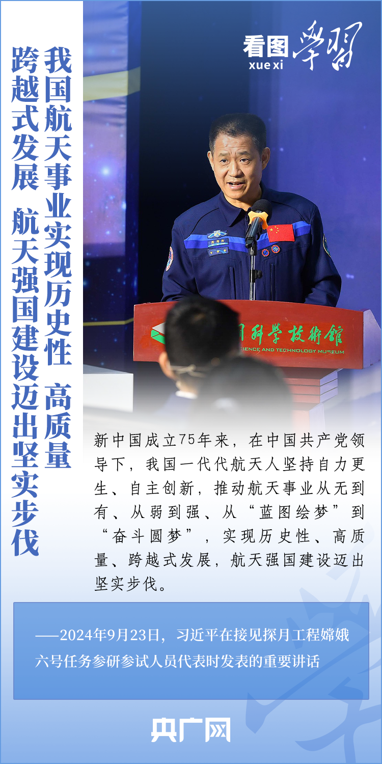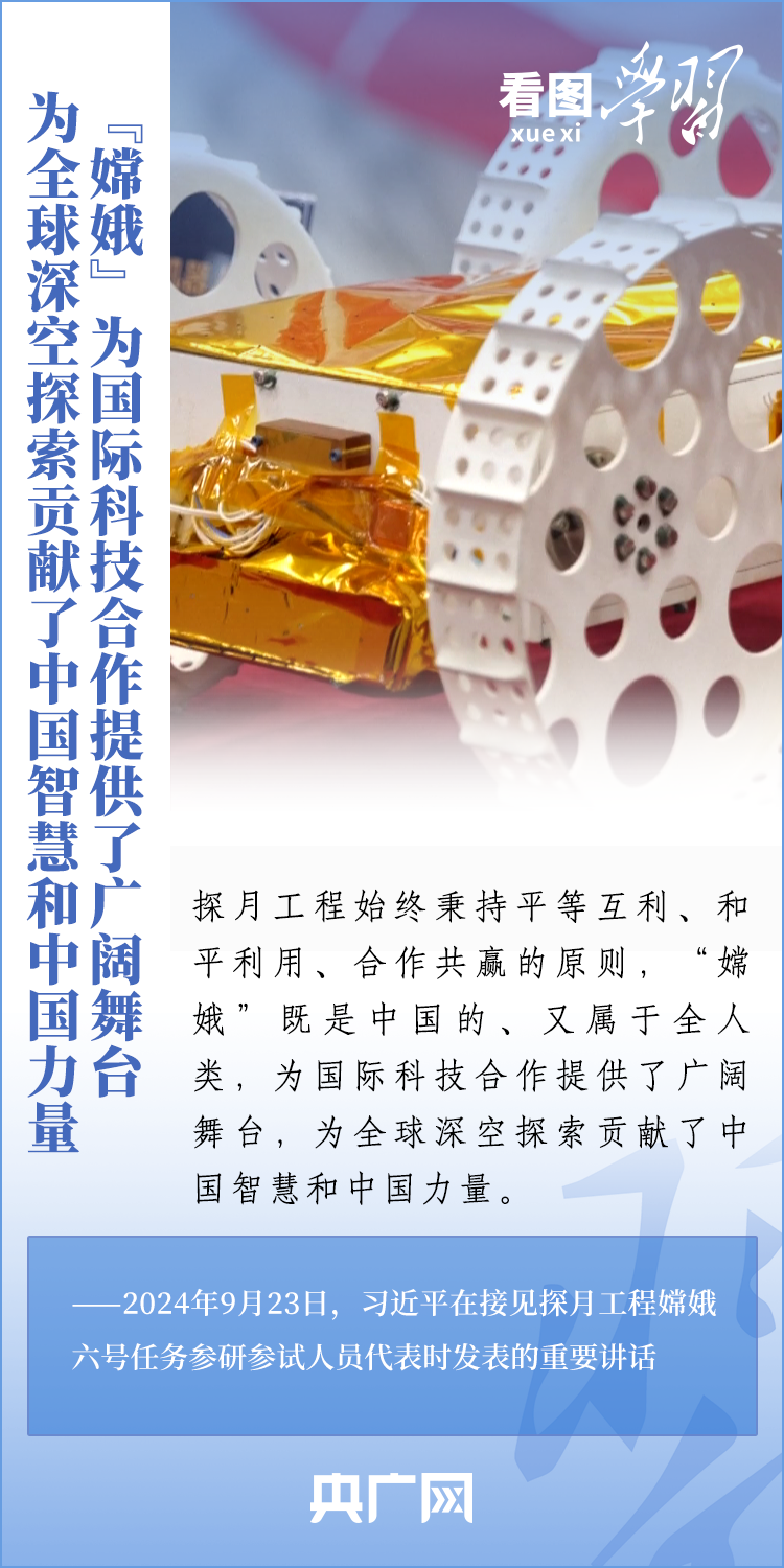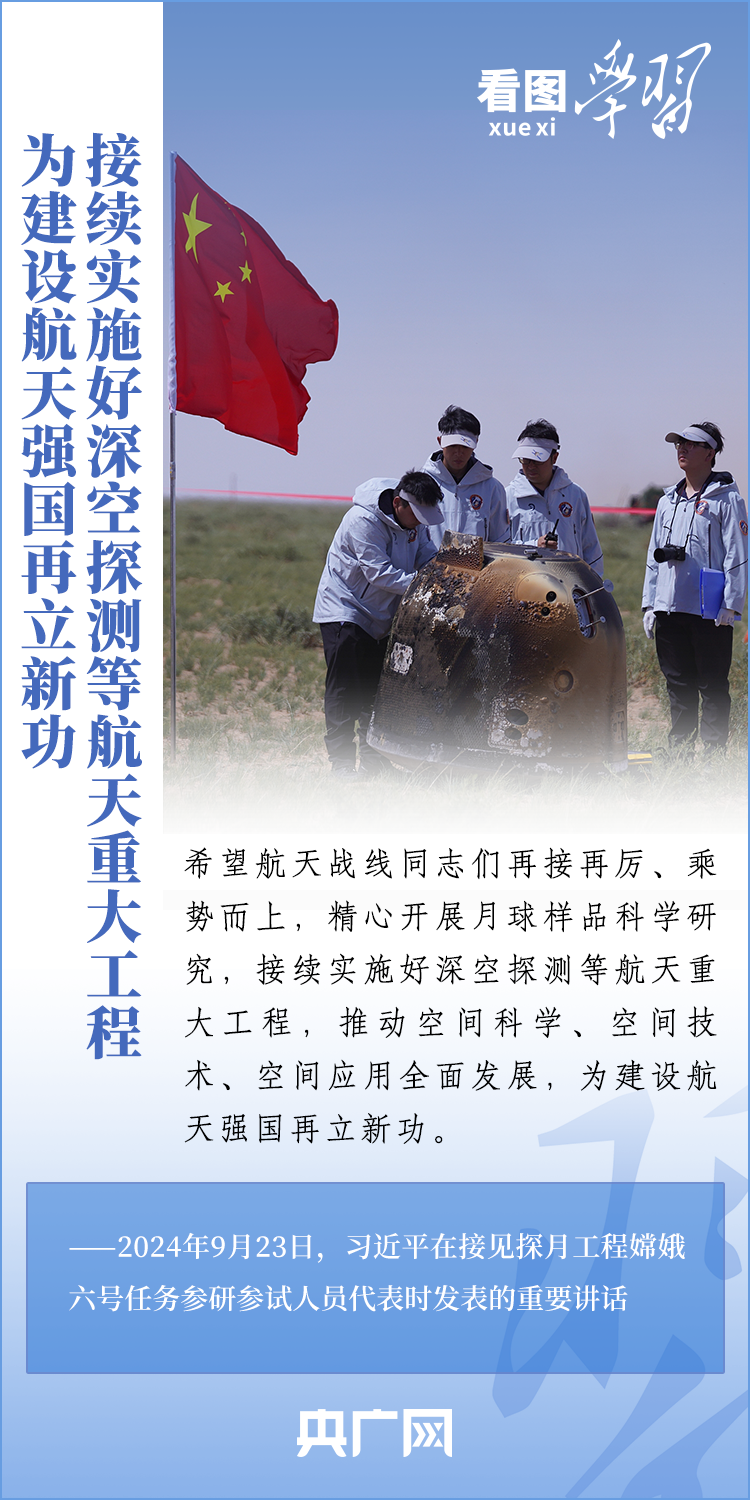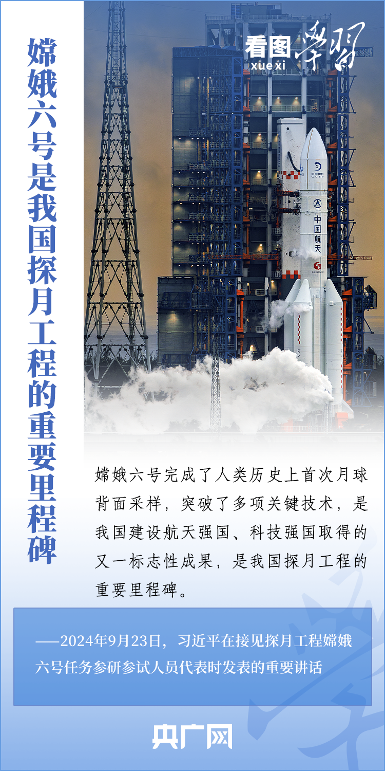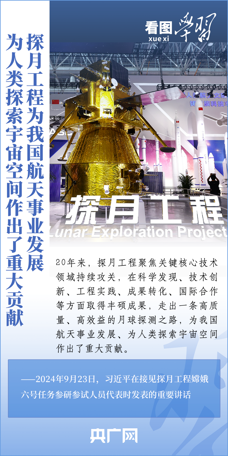 中國探月工程成果凝結著我國幾代航天人的智慧和心血。9月23日,習(xi) 近平總書(shu) 記接見探月工程嫦娥六號任務參研參試人員代表並發表重要講話。總書(shu) 記高度肯定嫦娥六號任務成功的重要意義(yi) ,以及探月工程為(wei) 我國航天事業(ye) 發展、為(wei) 人類探索宇宙空間作出的重大貢獻,勉勵航天戰線工作者再接再厲、乘勢而上,為(wei) 建設航天強國再立新功。一起來學習(xi) !