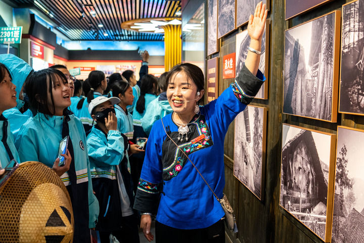 在湖南湘西十八洞村,講解員施豔琴為(wei) 遊客講解十八洞村的故事(2023年11月1日攝)。新華社記者 陳思汗 攝