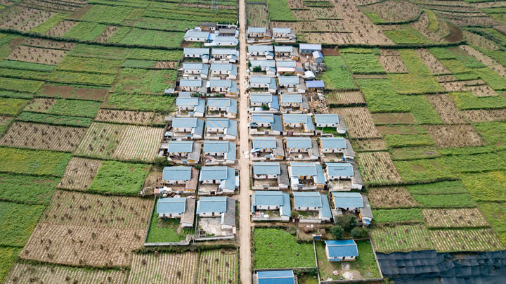 俯瞰四川省昭覺縣地莫鄉(xiang) 地莫村田園中的新居(2020年10月10日攝,無人機照片)。新華社記者 張笑宇 攝