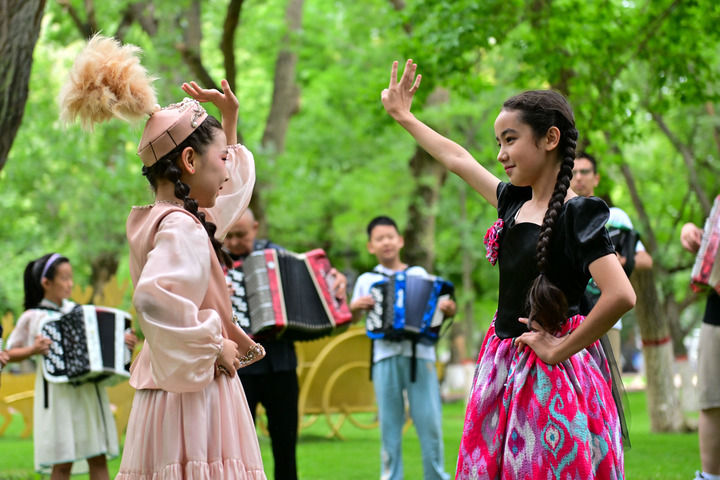 在新疆塔城市文化廣場,練習(xi) 手風琴的孩子隨著琴聲翩翩起舞(2024年7月24日攝)。新華社記者 丁磊 攝