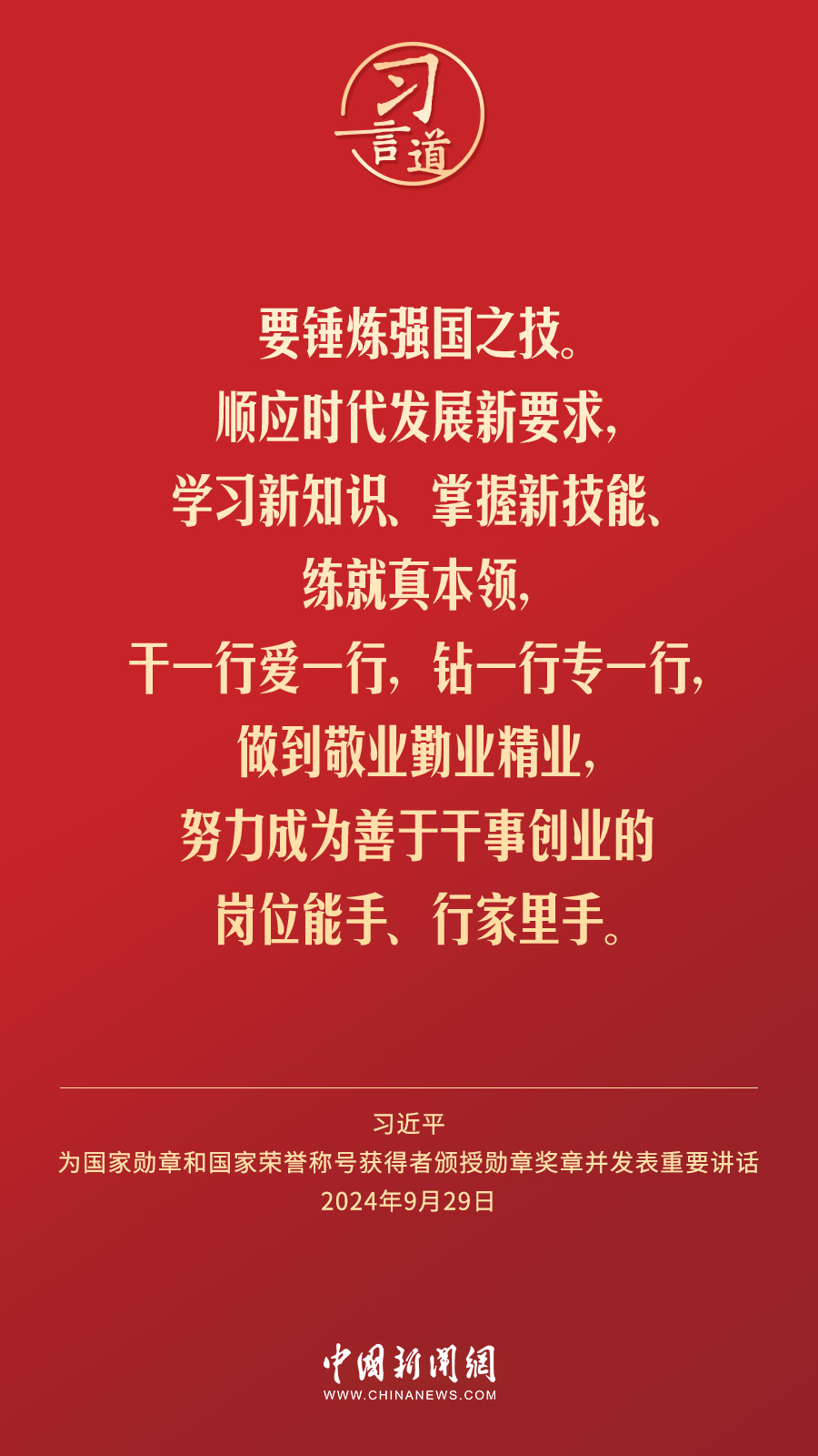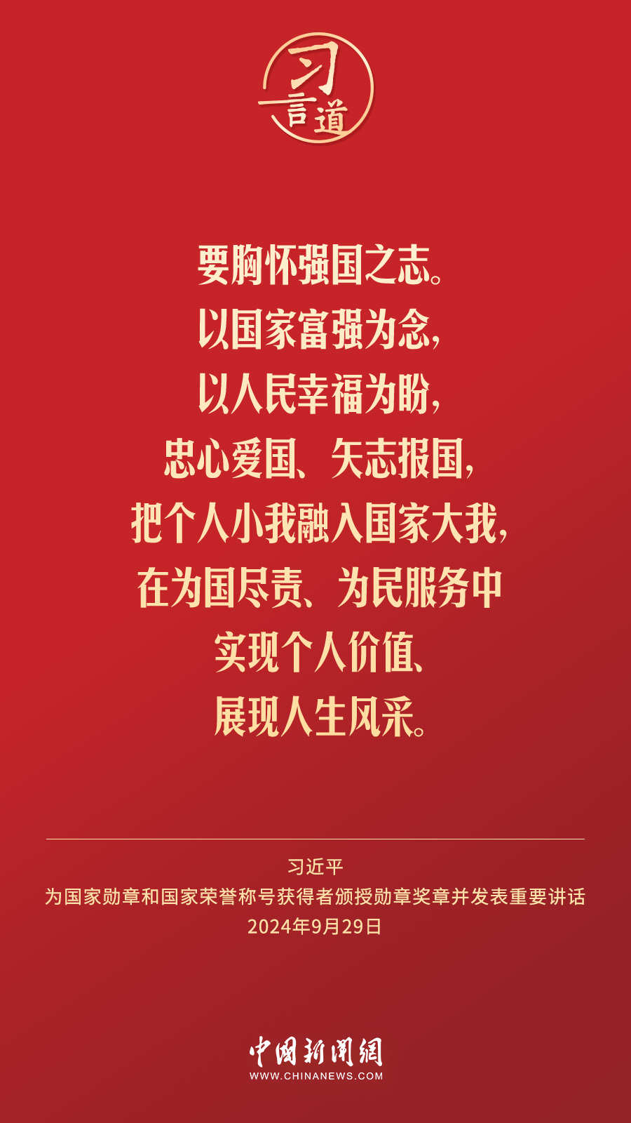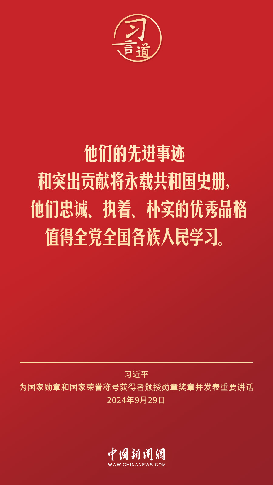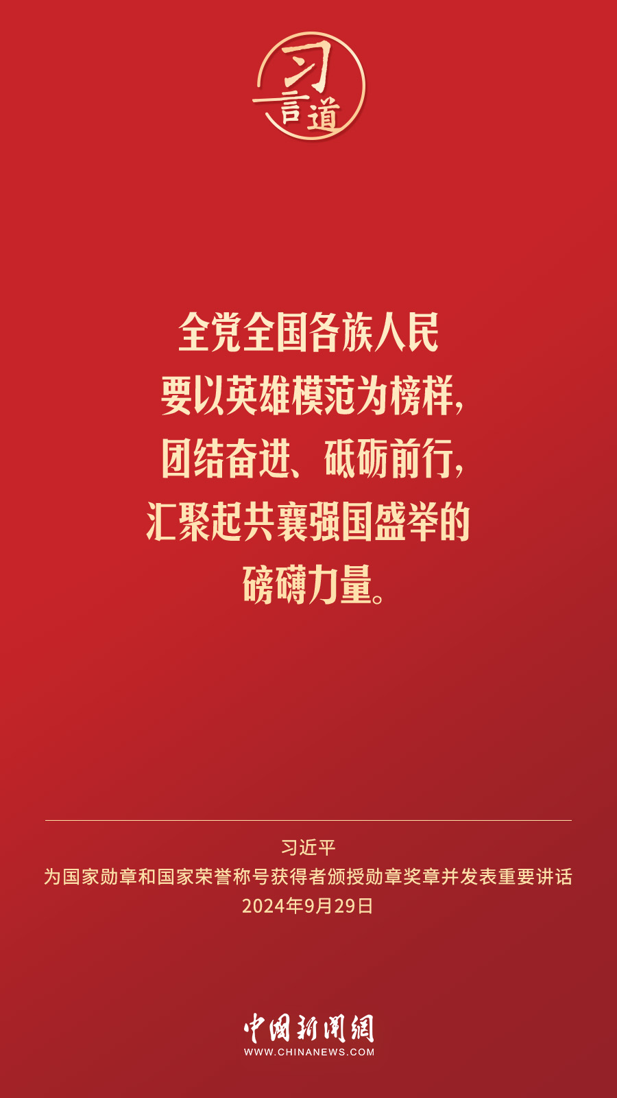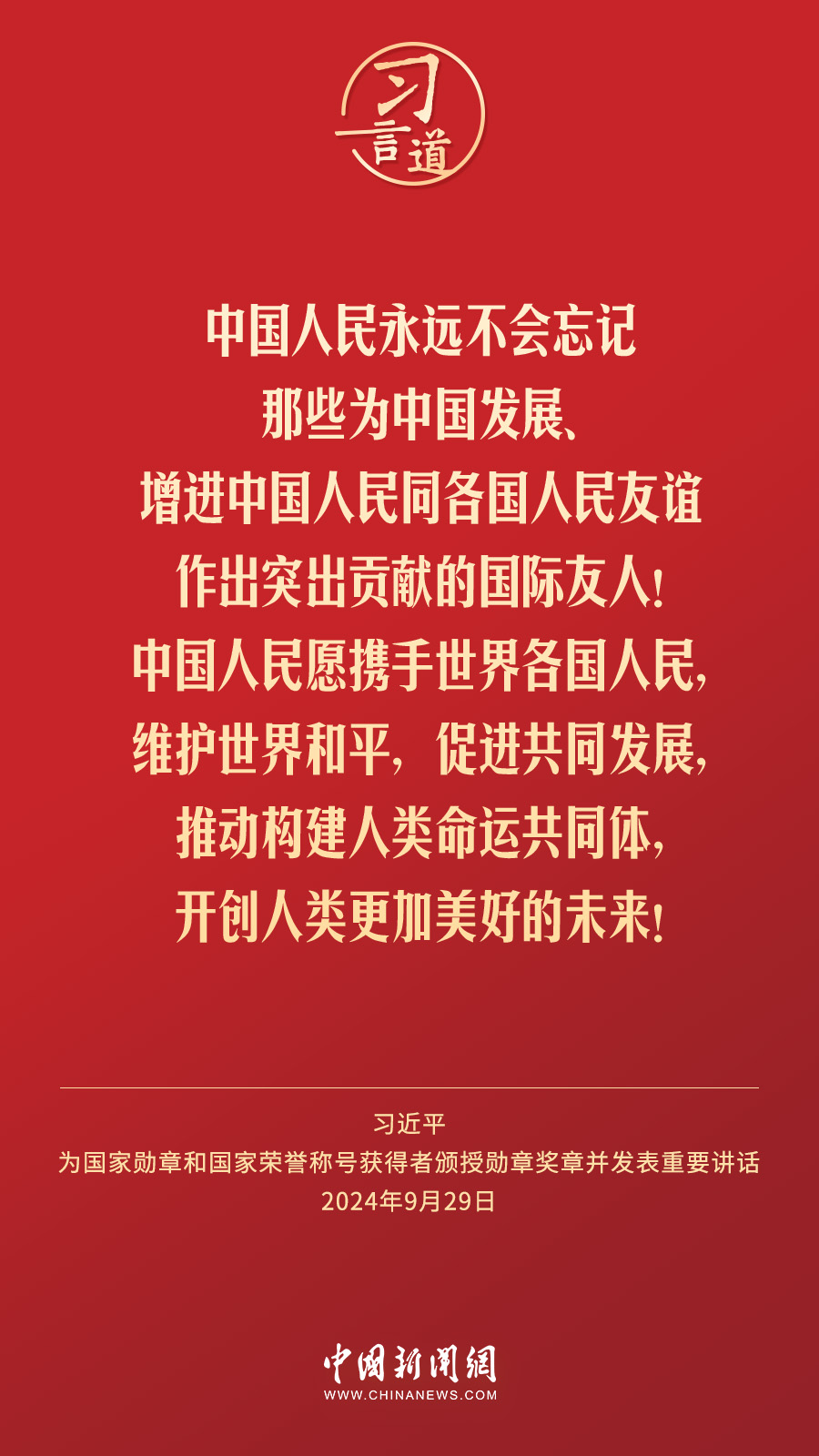 經中共中央批準,中華人民共和國國家勳章和國家榮譽稱號頒授儀(yi) 式於(yu) 9月29日上午10時在人民大會(hui) 堂隆重舉(ju) 行。中共中央總書(shu) 記、國家主席、中央軍(jun) 委主席習(xi) 近平向國家勳章和國家榮譽稱號獲得者分別授予“共和國勳章”“友誼勳章”和國家榮譽稱號獎章並發表重要講話。習(xi) 近平指出——