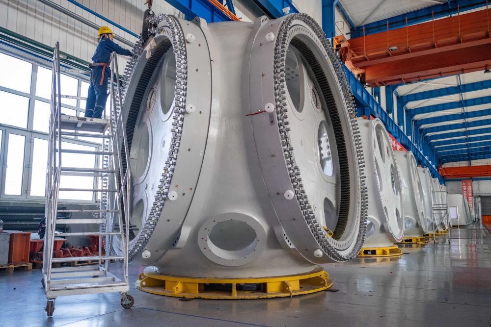 2024年4月28日,工作人員在中國一重集團有限公司的風電設備裝配車間內(nei) 加工風電輪轂。