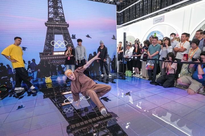 2024年9月14日,在2024年服貿會(hui) 國家會(hui) 議中心綜合展區的主賓國法國展台,中法兩(liang) 國街舞好手在表演霹靂舞。