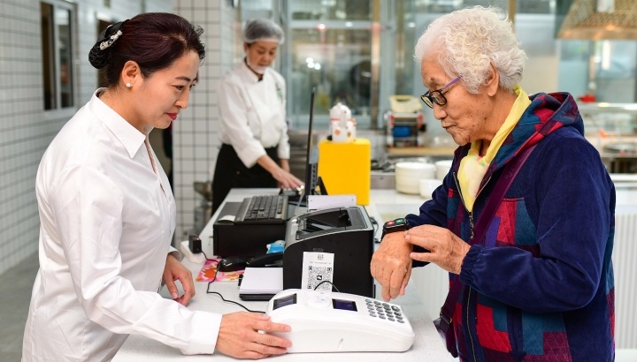 內(nei) 蒙古鄂爾多斯,一位老人在“鄰裏食堂”掃碼用餐