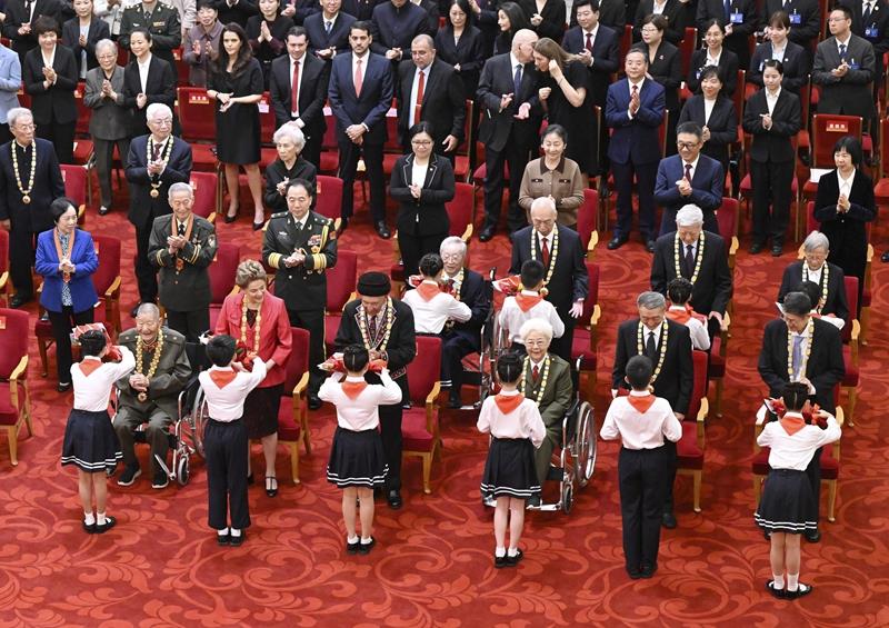 2024年9月29日,少先隊員向國家勳章和國家榮譽稱號獲得者敬禮致意。
