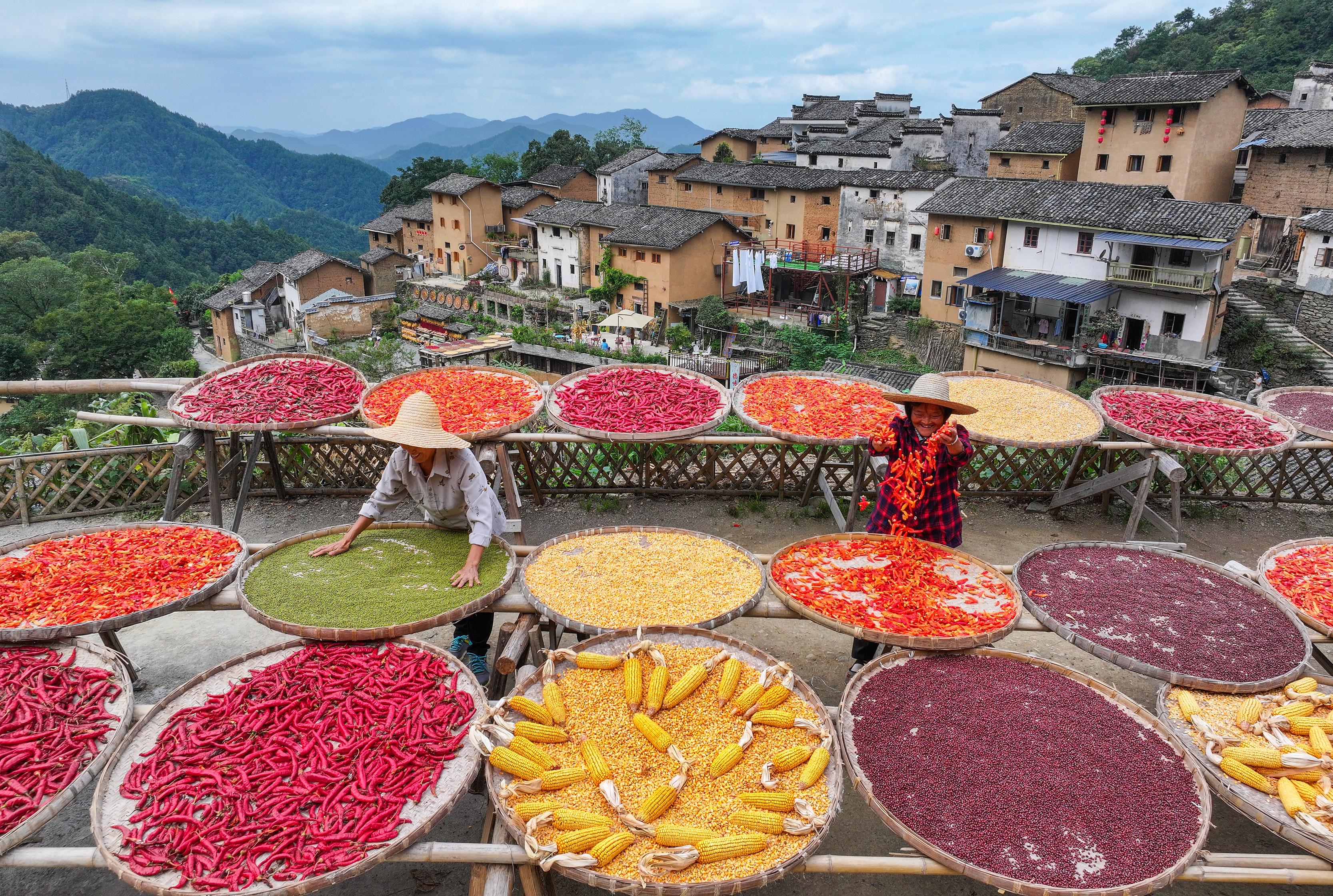 2024年9月22日,安徽省黃山市歙縣陽產(chan) 村,村民正在土樓前晾曬農(nong) 作物。