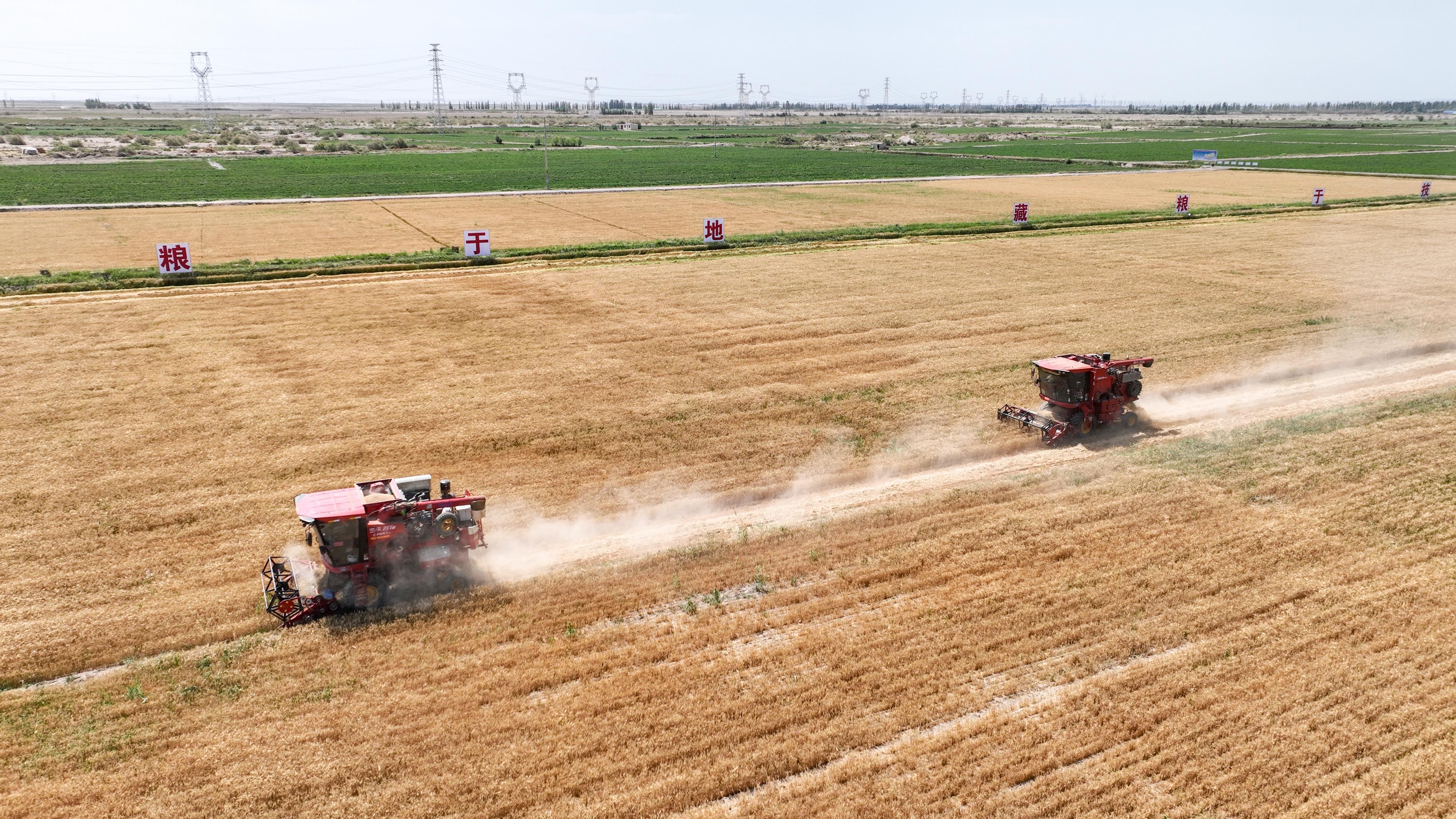 2024年7月10日,在甘肅省酒泉市金塔縣東(dong) 壩鎮小河口村中度鹽堿耕地綜合治理利用示範點,1000餘(yu) 畝(mu) 鹽堿地小麥喜獲豐(feng) 收。