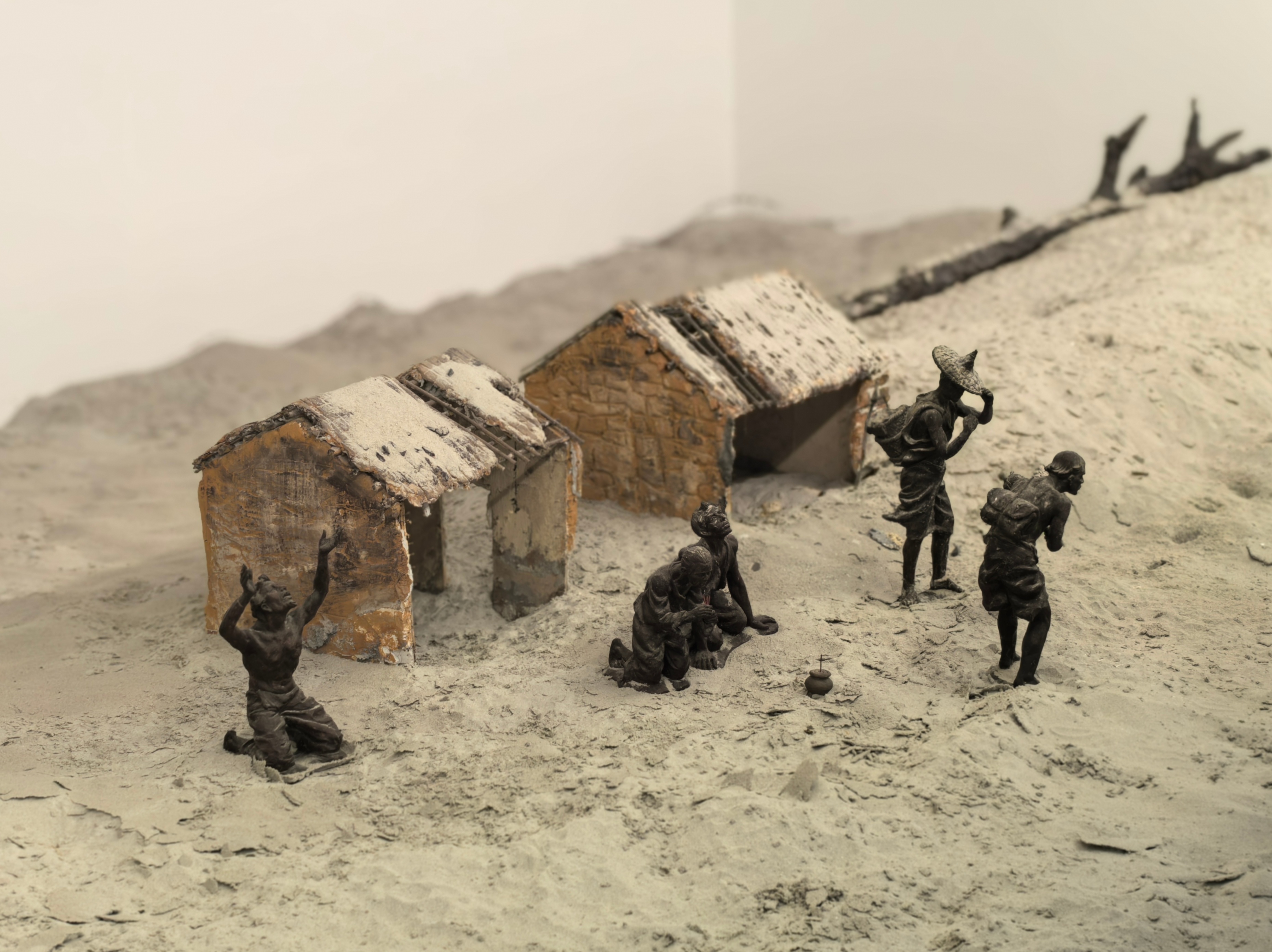 穀文昌紀念館裏展示的當年東(dong) 山人民飽受風沙災害之苦的情景。(總台央廣記者潘毅拍攝)
