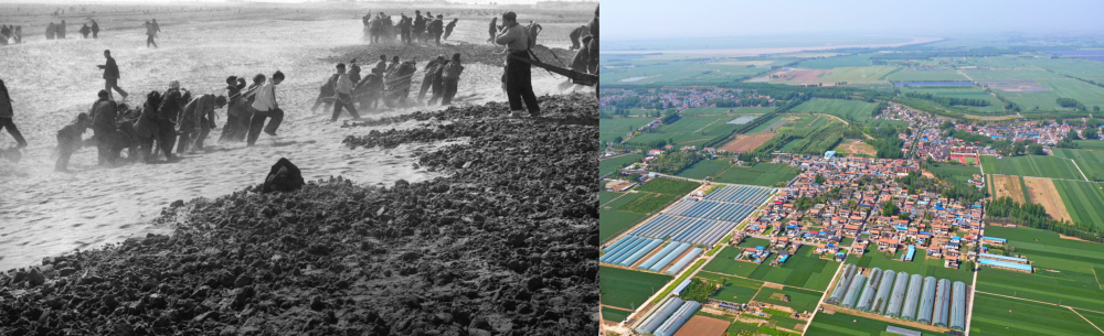 拚版照片:左圖為(wei) 蘭(lan) 考群眾(zhong) 在拉淤土壓沙(新華社記者 鄧曆耕 攝);右圖為(wei) 2024年4月25日拍攝的蘭(lan) 考縣張莊村(無人機照片,新華社記者 郝源 攝)。