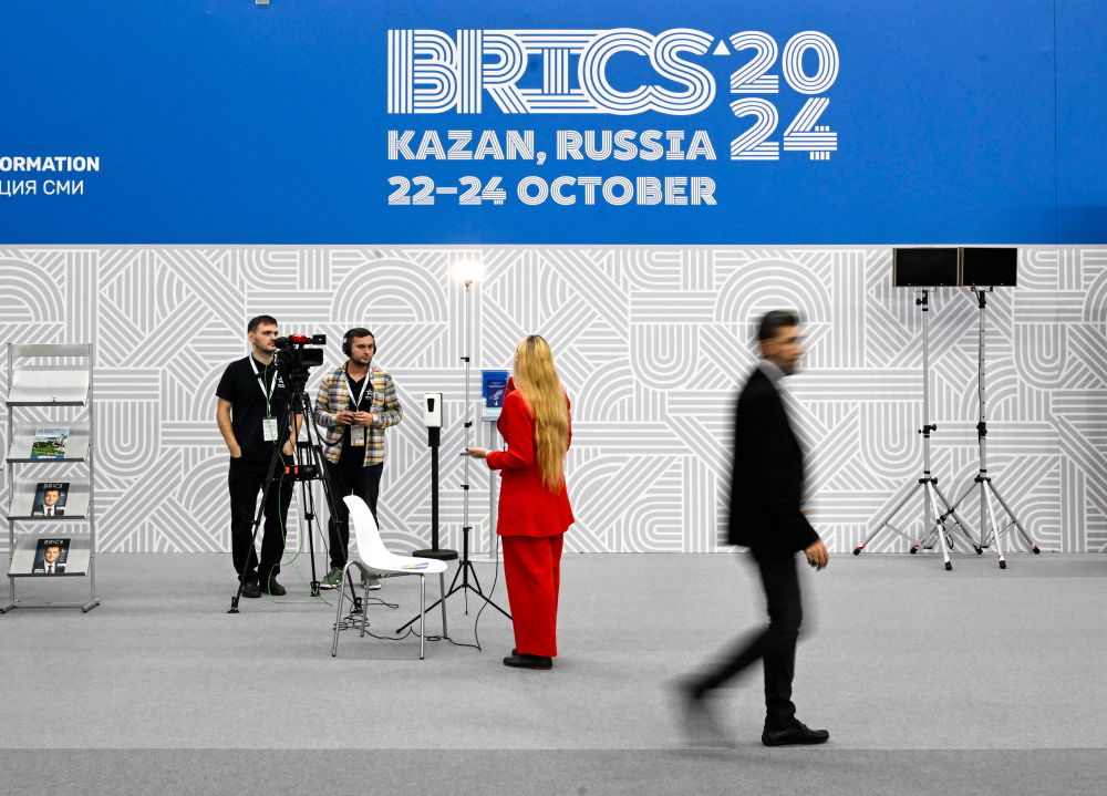 2024年10月23日,媒體(ti) 工作人員在俄羅斯喀山金磚峰會(hui) 新聞中心工作。新華社記者 申宏 攝