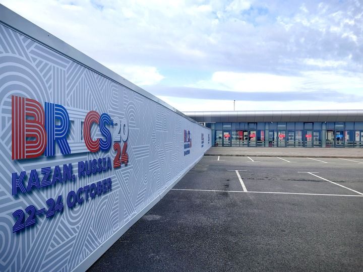 這是2024年10月23日在俄羅斯喀山金磚峰會(hui) 新聞中心拍攝的金磚峰會(hui) 標識。新華社記者 申宏 攝