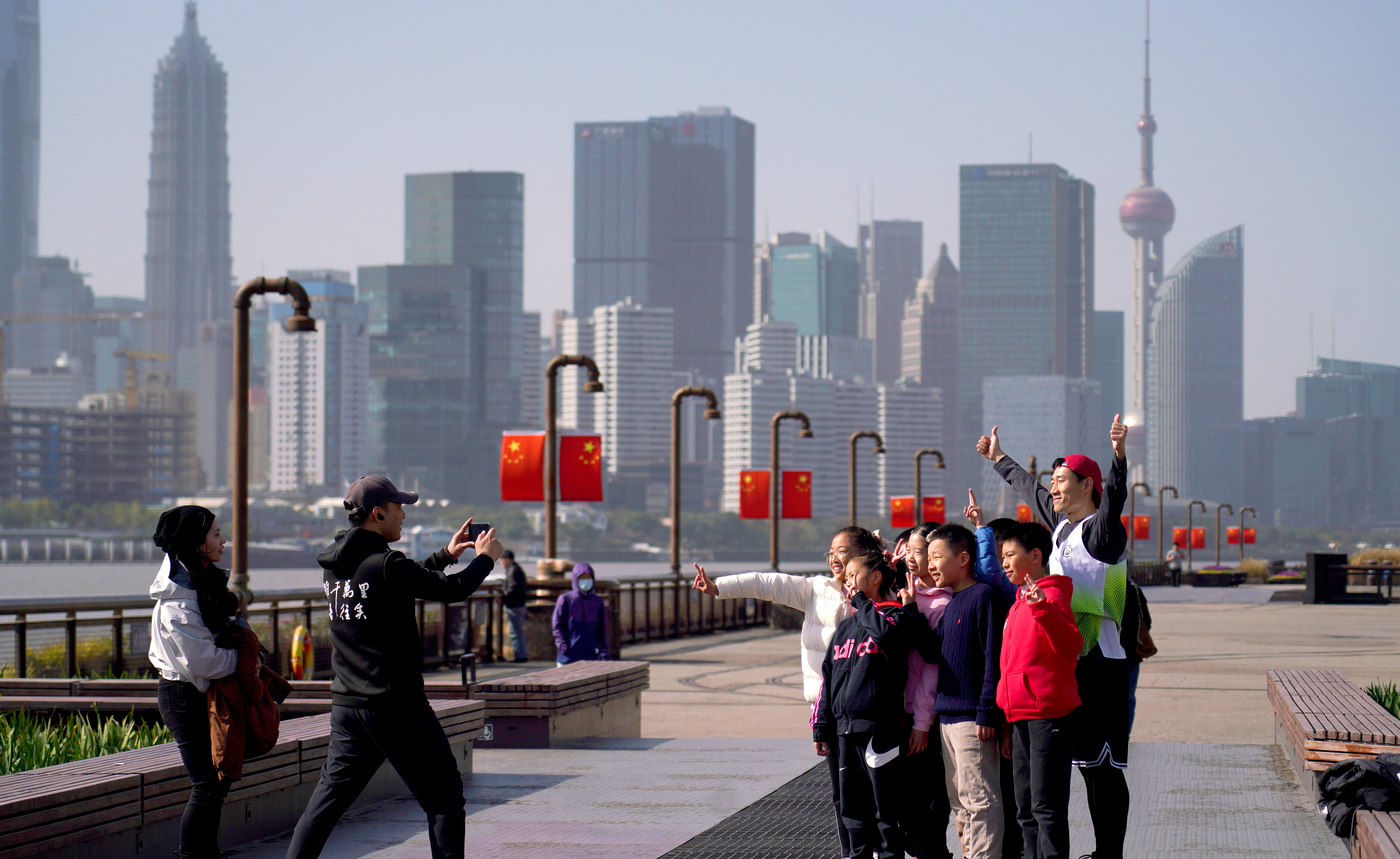 △ 2023年11月17日,市民遊客在上海楊浦濱江岸線觀光拍照。