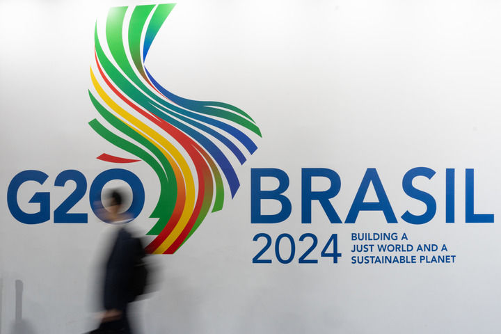 2024年2月21日,在巴西裏約熱內(nei) 盧,一名男子經過G20標識。二十國集團外長會(hui) 議2月21日和22日在巴西裏約熱內(nei) 盧舉(ju) 行。新華社記者 王天聰 攝