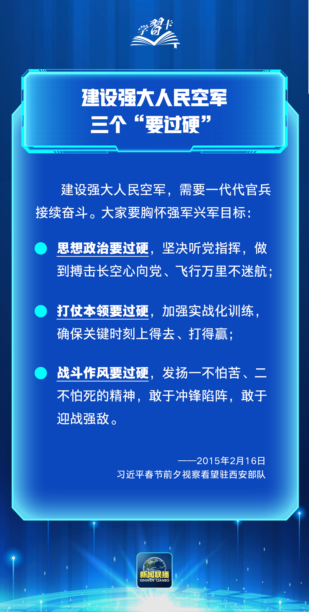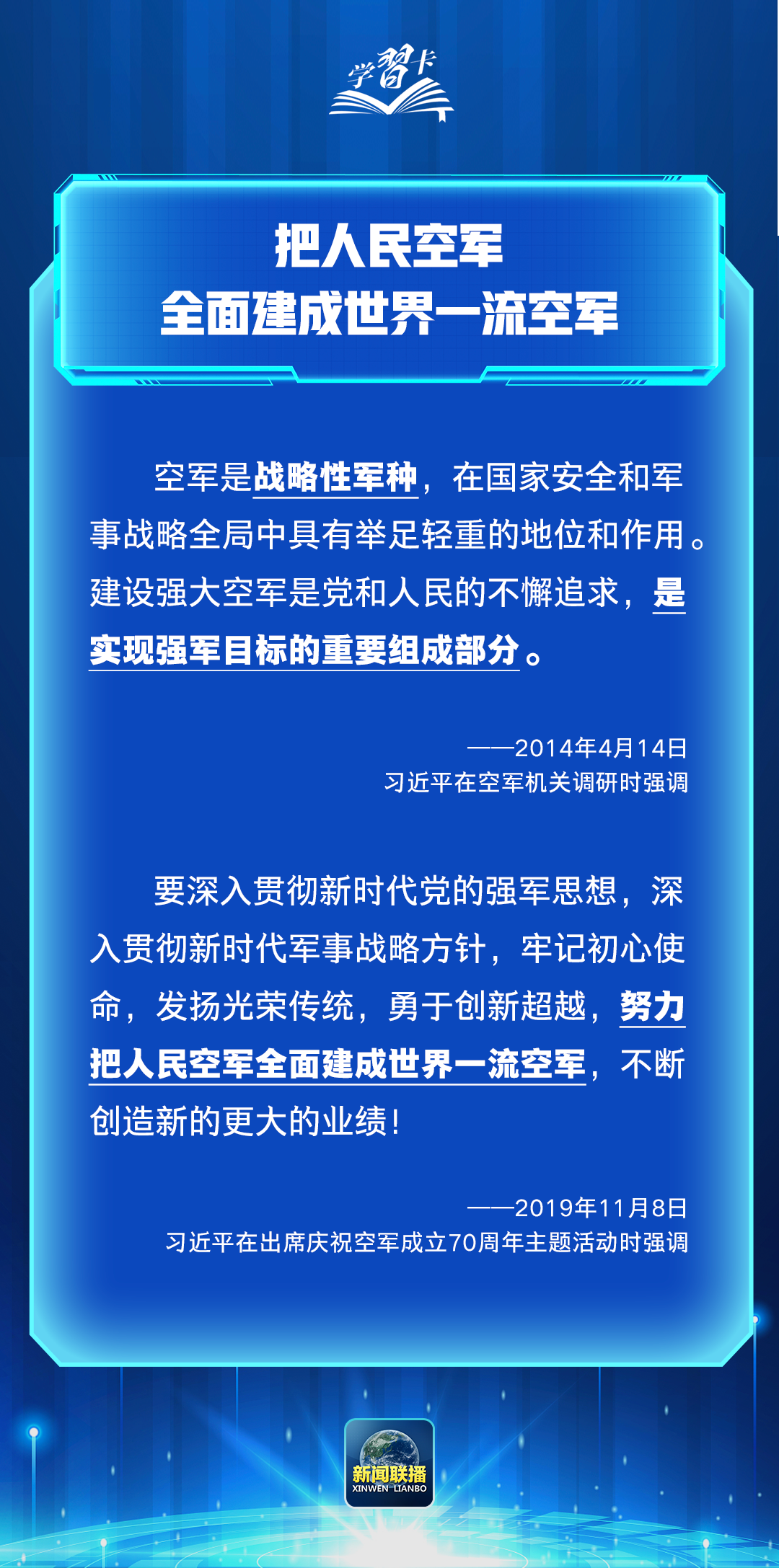 2024年11月11日,是中國人民解放軍(jun) 空軍(jun) 成立75周年紀念日。在黨(dang) 的堅強領導下,一代代空軍(jun) 官兵胸懷淩雲(yun) 壯誌,搏擊萬(wan) 裏長空,推動空軍(jun) 建設取得舉(ju) 世矚目的成就,為(wei) 維護國家主權、安全、發展利益建立了不朽功勳。如何把人民空軍(jun) 全麵建成世界一流空軍(jun) ?一起學習(xi) ↓